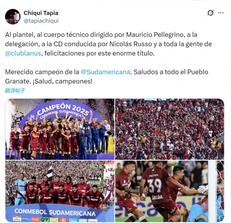 拉努斯问鼎南好意思杯,阿根廷足协主席塔皮亚社媒发文致贺