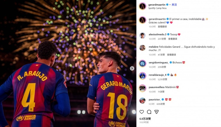 客串中卫进展出色!赫拉德·马丁晒烟花照:难以忘怀的诺坎普首秀