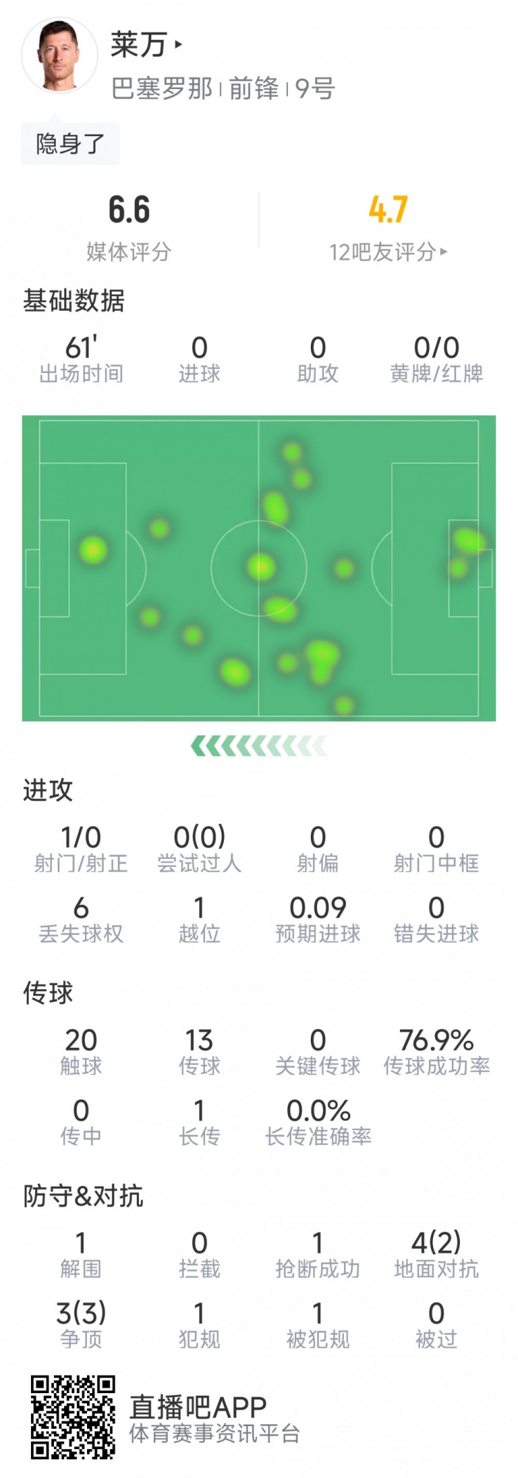 契机寥寥,莱万本场数据:1次射门0射正,7挣扎5得胜,评分6.6分