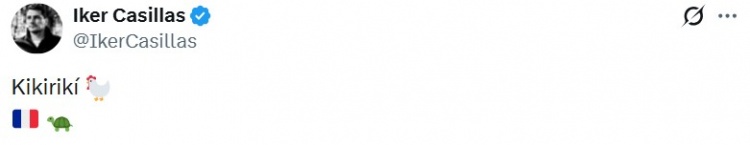 皇马名宿卡西利亚斯也在社媒发文爱慕姆巴佩献艺帽子戏法的速率,配文:“Kikirikí”