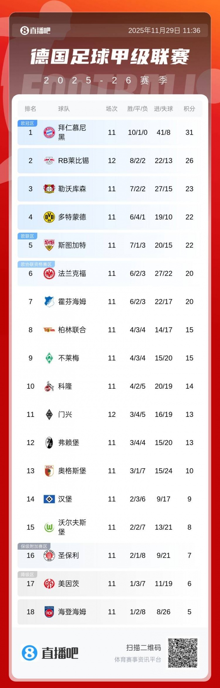 莱比锡战平后仍居德甲第2,领有3分卓绝上风,因此德甲第2名本轮之后最多也只须26分。排在榜首的拜仁则将有契机将领跑上风扩大到8分。本轮拜仁将在主场对阵保级队圣保利。