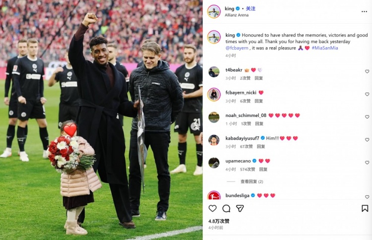 已是名宿!29岁科曼社媒晒照追思致意庆典:感谢拜仁邀请我转头