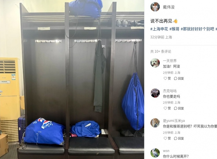 戴伟浚在社媒晒出了探员松手后更衣室的相片,他在更衣室的座位适值紧挨着于汉超的位置,看着于汉超打包好的衣物,因此他终点感触地配文“说不出重逢”。