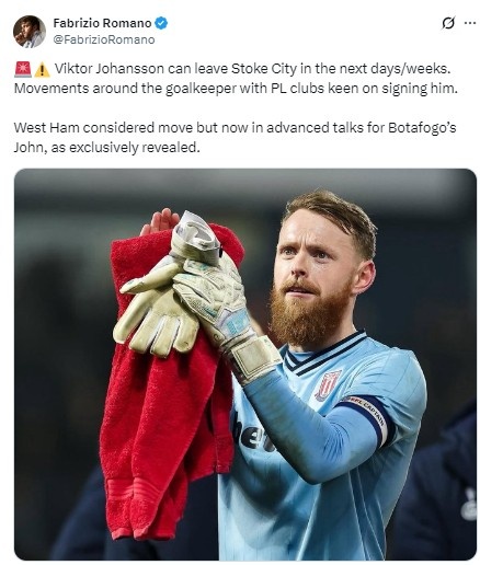 罗马诺:斯托克城门将约翰逊将离队,西汉姆等多家英超俱乐部有益