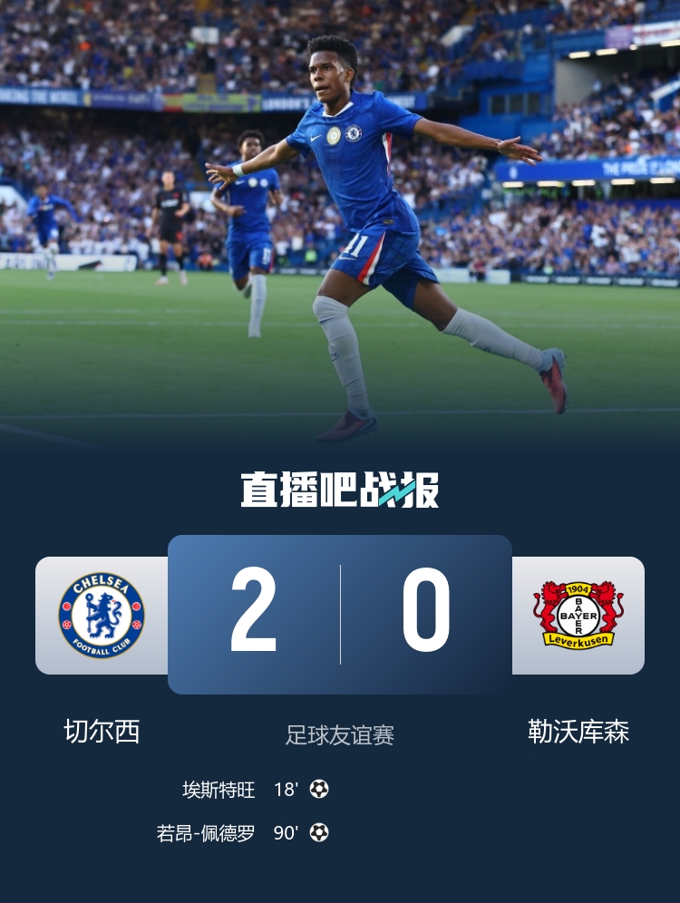 友谊赛对阵,切尔西2-0打败勒沃库森,埃斯特旺首秀破门,若昂-佩德罗也不时了进球情状。