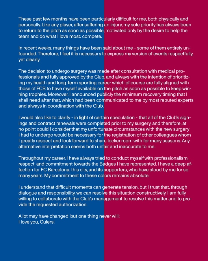 息争!巴萨官方:特狮已授权俱乐部提交医疗证明注解,规复队长身份