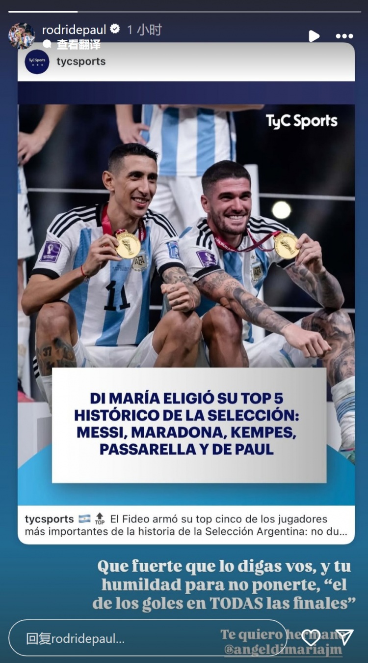 被天神评为阿根廷队史最进军五东谈主之一,德保罗:很讶异,爱你昆季