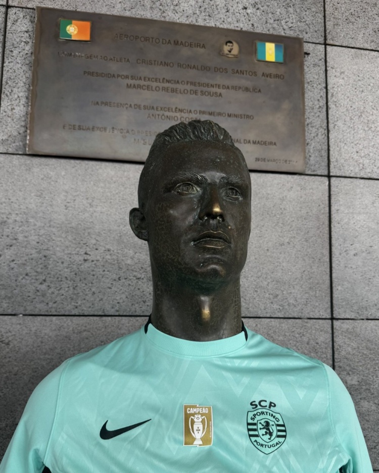 葡萄牙体育社媒晒出C罗在马德拉海外机场(又称C罗机场)的雕像相片,雕像身穿葡萄牙体育新赛季球衣。