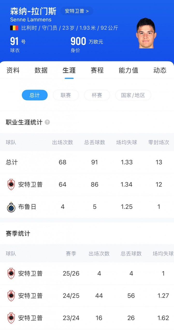 拉门斯现年23岁,比利时门将,身高1米93,上赛季为安特卫普出场44次。当今球员德回身价为900万欧元。