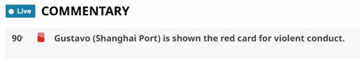 亚足联官网对这次事件的描摹为:古斯塔沃(上海海港)因暴力作为被红牌罚下。