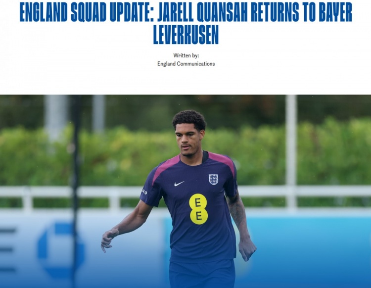 官方:宽萨因伤退出英格兰队复返勒沃库森,球队暂无增补球员计较