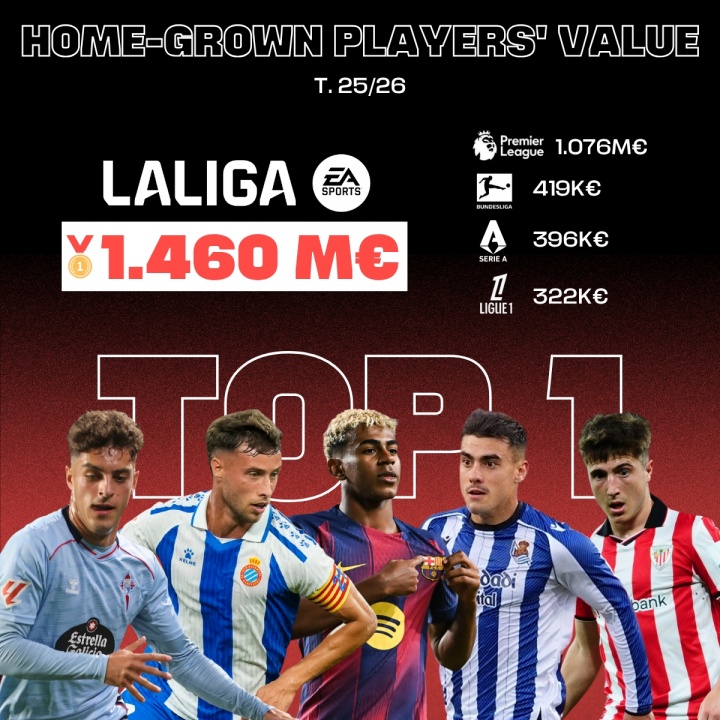 西甲是欧洲青训球员总市集价值最高的联赛,达14.6亿欧元,远超英超(10.7亿欧元)、德甲(9.6亿欧元)、意甲(8.9亿欧元)及法甲(7.6亿欧元)。在2025年夏日转会窗口中,西班牙俱乐部通过原土青训球员转会创下2.89亿欧元的收入记载,创历史新高,印证了其青训计谋的得胜。
