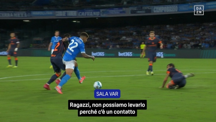 VAR: "如实,迪洛伦佐有介入,但他介入是因为一个当作……他并不是为了争取不属于球的空间而伸腿,而是为了保护球而伸腿。咱们来看一下姆希塔良的当作,稍等。望望迪洛伦佐的脸,他正保护着球。稍等一下,我在核实。”