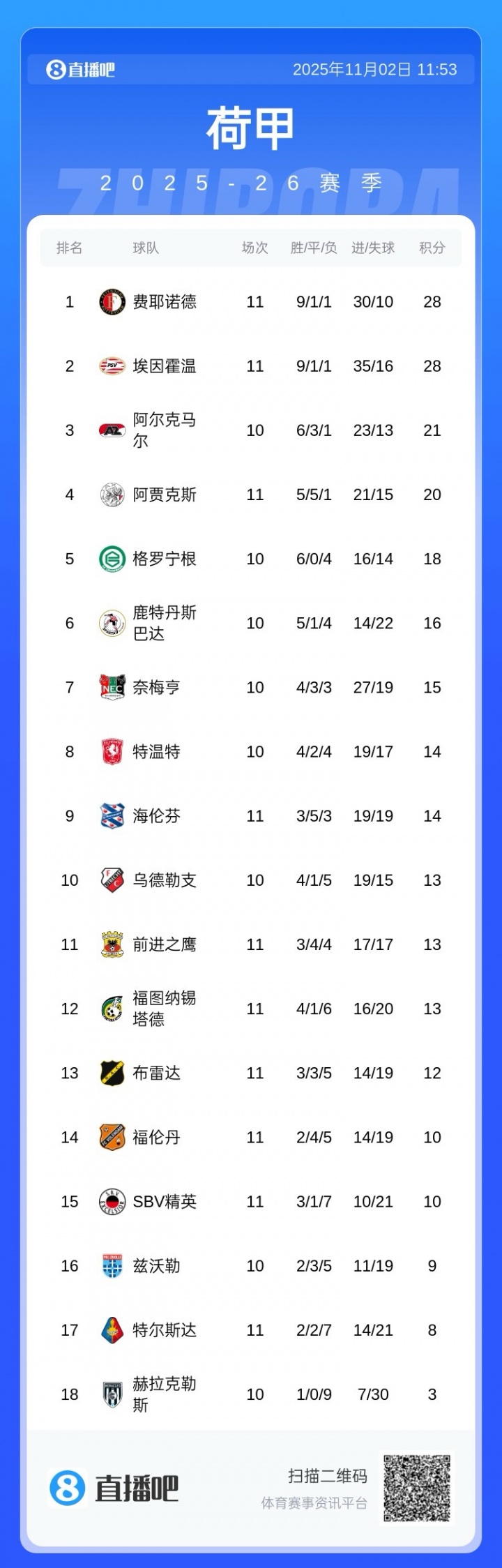 荷甲11轮事后,主讲解范佩西指挥费耶诺德9胜1平1负,进30球丢10球,积28分排在荷甲第一。