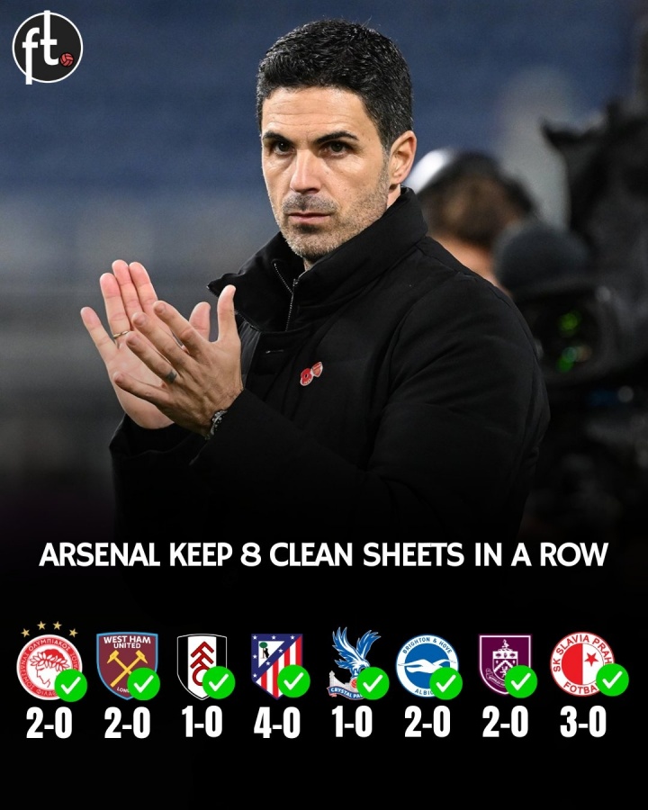 据数据统计,阿森纳追平了俱乐部在1903年创造的最长零封场次记载(8场)。
