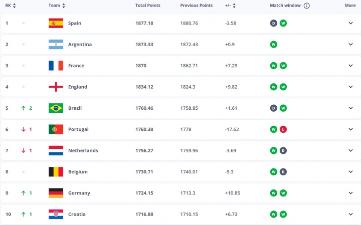 FIFA最新名次:西班牙、阿根廷前2,巴西升至第5,意大利跌至第12