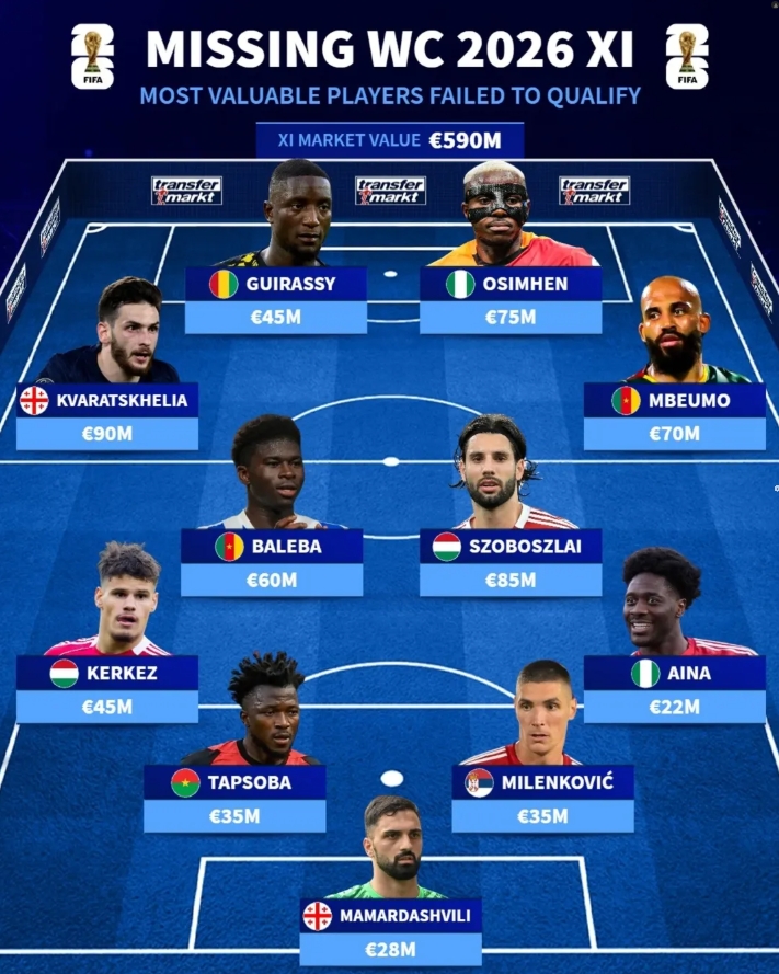 当天德转社媒晒图,列出无缘2026天下杯球员中身价最高的首发声势,奥斯梅恩、姆伯莫、K77、索博斯洛伊等多名球星在列。