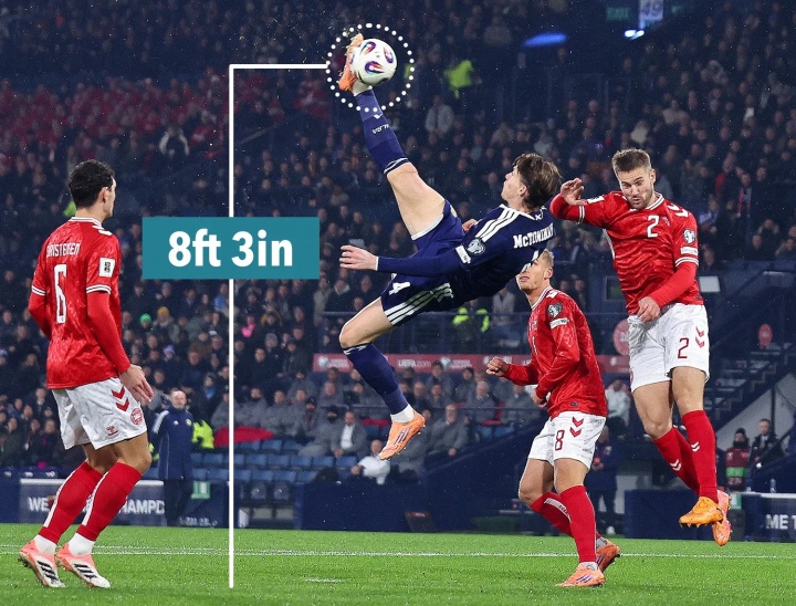 欧洲区世初赛小组赛末轮,苏格兰4-2驯顺丹麦,晋级2026天下杯,麦克托米奈在比赛中打入一粒精彩倒钩。