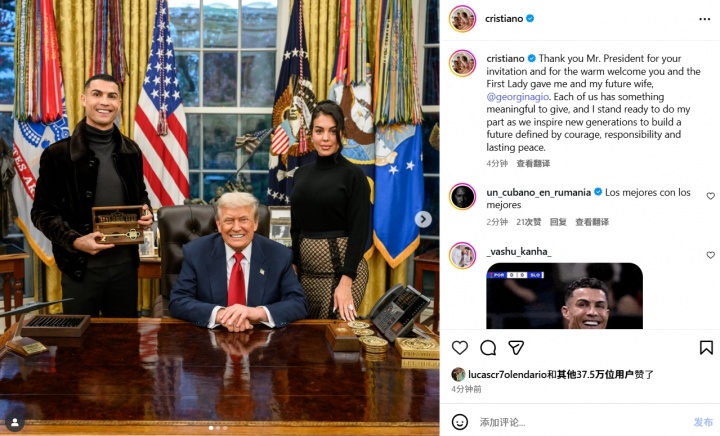 白宫官网发布了C罗携只身妻乔治娜窥伺特朗普办公室,与特朗普交谈、合影的组图。