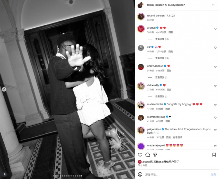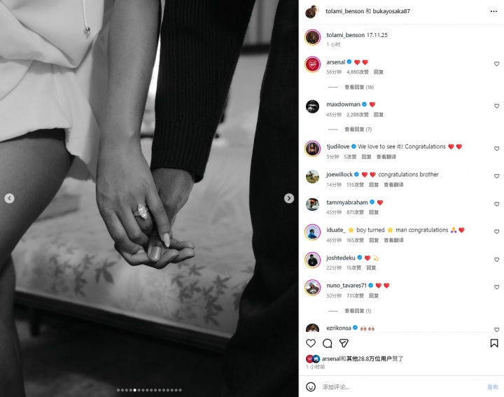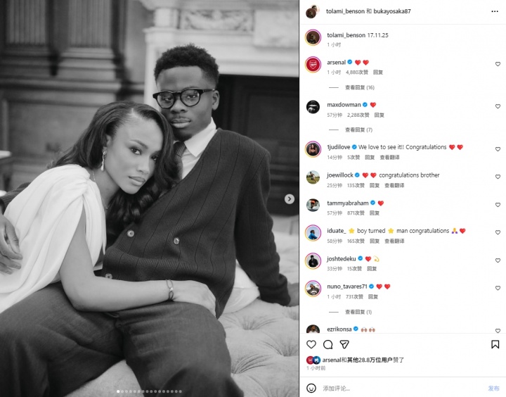 这则帖子也获取了萨利巴、加布里埃尔、埃泽等队友以及阿森纳官方的辩驳道喜。