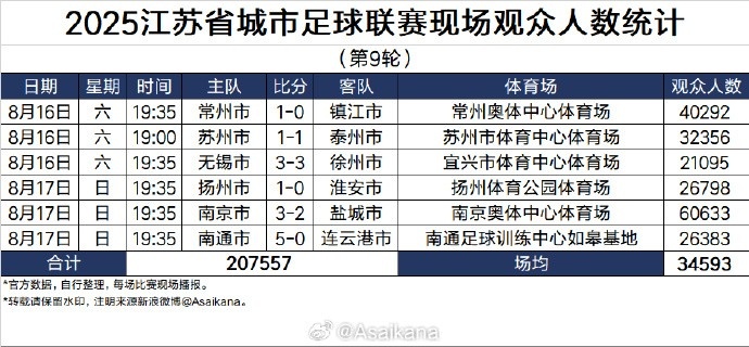 8月17日讯 2025江苏省城市足球联赛现场不雅世东说念主数统计(第9轮),本轮南京奥体以60633东说念主再度刷新苏超不雅世东说念主数记录,单轮总东说念主数达207557东说念主,场均34593东说念主,均再改造高。放胆当今苏超联赛通盘比赛不雅众总东说念主数为1312746东说念主,场均24310东说念主,已超过接近中超水平。