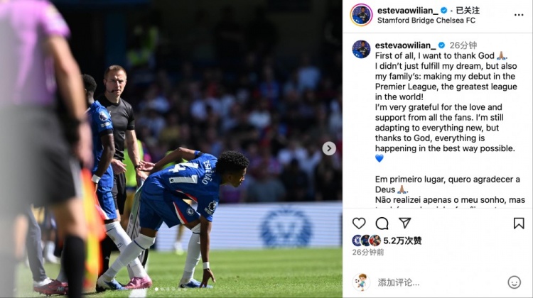 赛后,埃斯特旺更新社媒向球迷致谢,并晒照顾虑我方英超首秀。