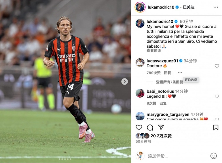 莫德里奇社媒:米兰我的新家,感谢米兰球迷赐与我的宽容和热心