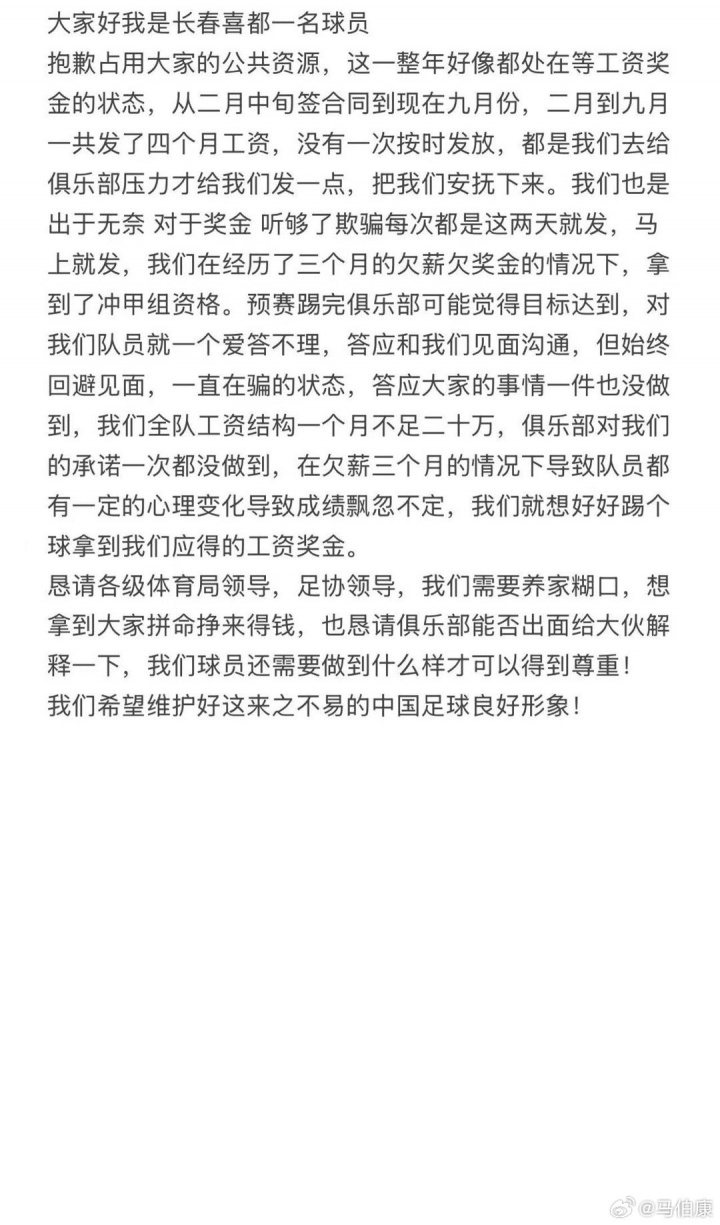 恳请各级体育局率领,足协率领,咱们需要养家生涯,念念拿到大师拚命挣来得钱,也恳请俱乐部能否露面给大伙解说一下,咱们球员还需要作念到什么样才不错获得尊重!