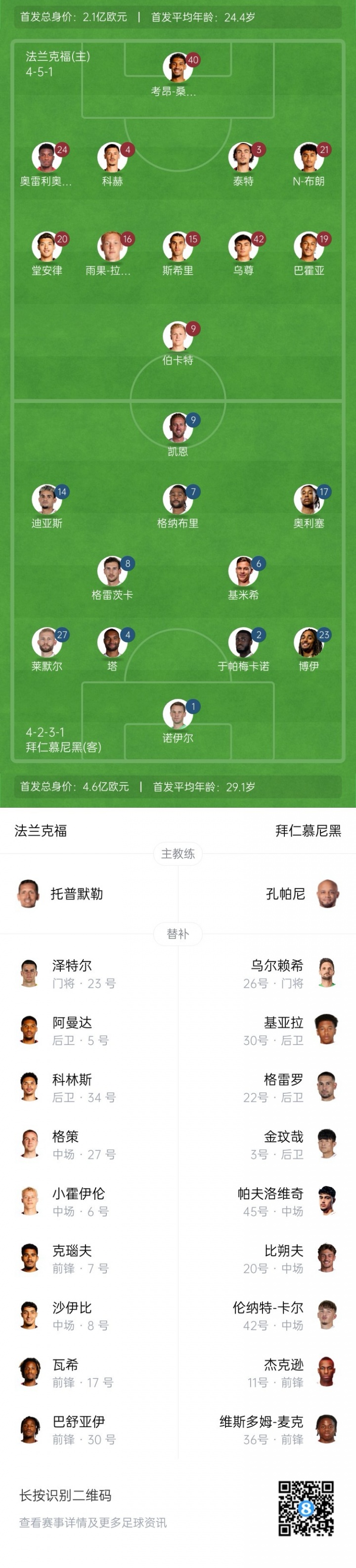 法兰克福替补:23-泽特尔、5-阿曼达、34-科林斯、27-格策、6-奥斯卡·霍伊伦、7-克瑙夫、8-沙伊比、17-瓦希、30-巴舒亚伊