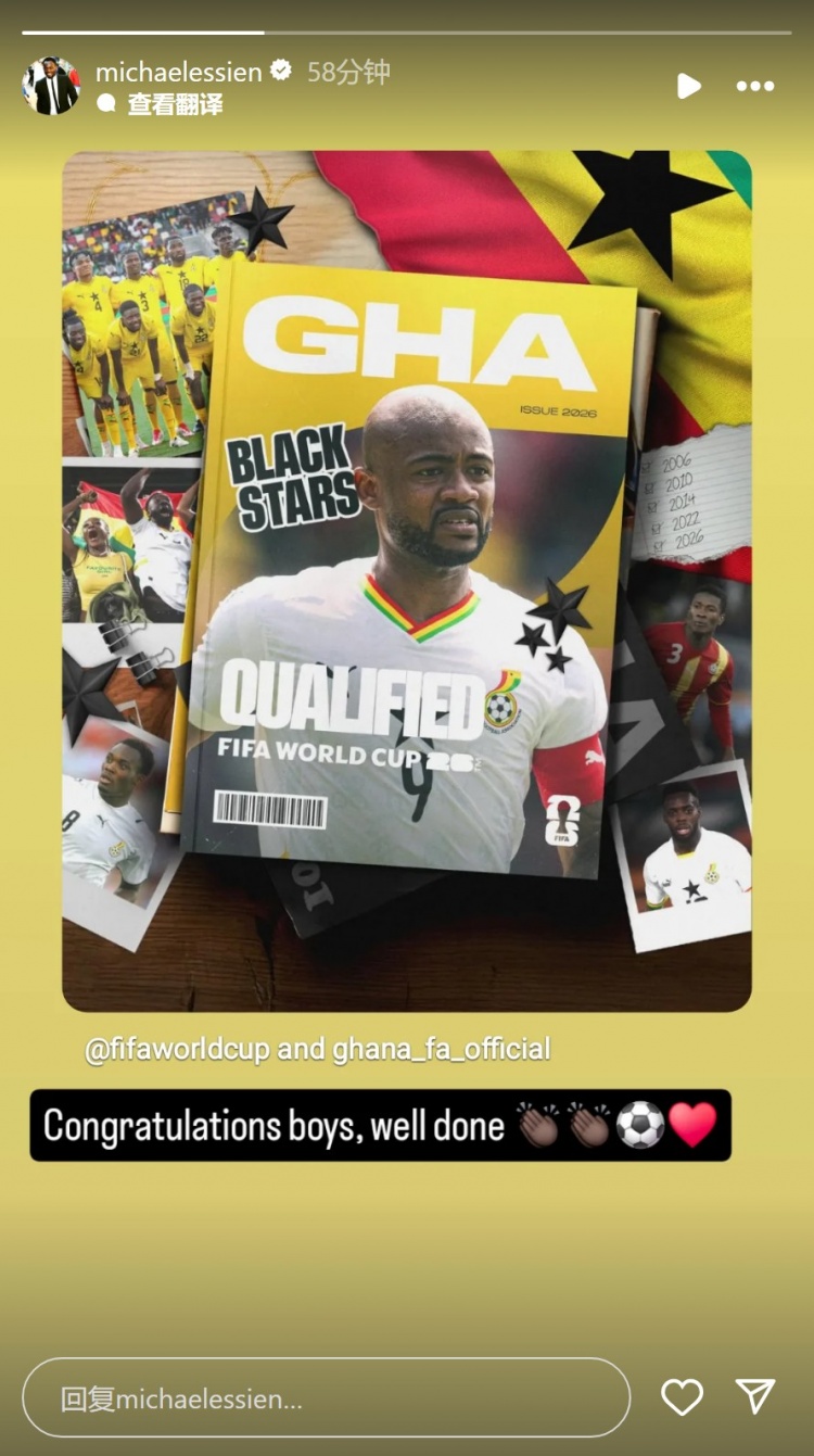 加纳足坛名宿埃辛社媒转发海报,道喜加纳进犯寰宇杯,配文:“恭喜小伙子们,干得好!”