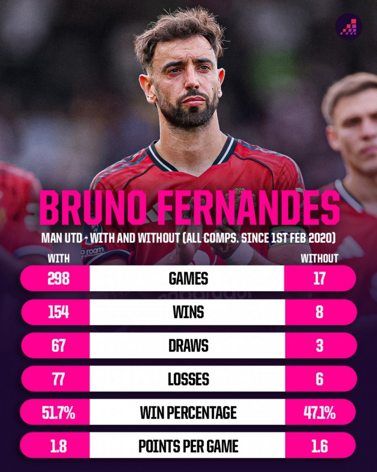 10月14日讯 Opta统计了B费加盟曼联以来出场、缺席情况下球队的战绩,并作念出对比。