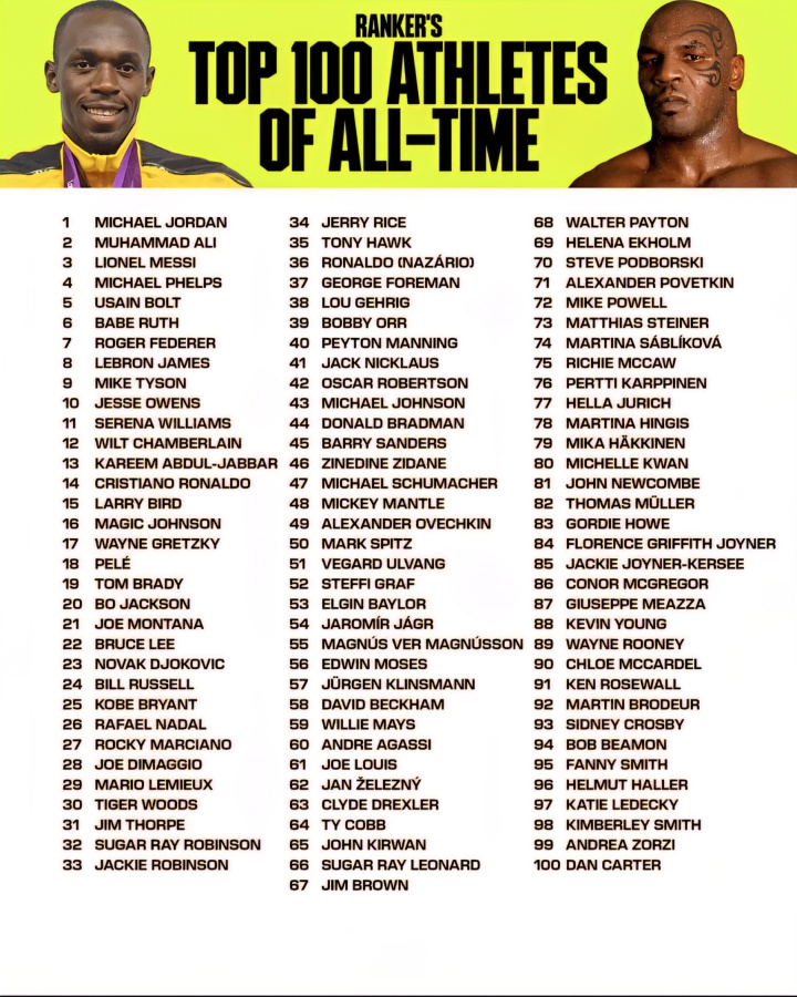 11月02日讯 外媒Global Statistics排历史百大畅通员,梅西第3,仅次于乔丹和拳王阿里。足坛9东谈主上榜,仅梅西干涉前10,C罗第14、贝利第18、大罗第36、王人达内第46。