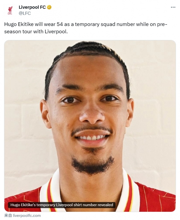 07月24日讯 利物浦官方书记,新援先锋埃基蒂克将在季前赛身穿54号,当作临时球衣号码,他在利物浦的负责球衣号码还有待证据。
