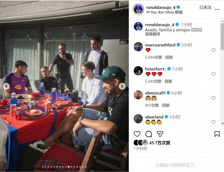 阿劳霍晒出与拉什福德、库巴西、卡萨多、巴尔德、加维、拉菲尼亚等队友约聚的相片,配文:“烧烤、家东说念主与一又友。”