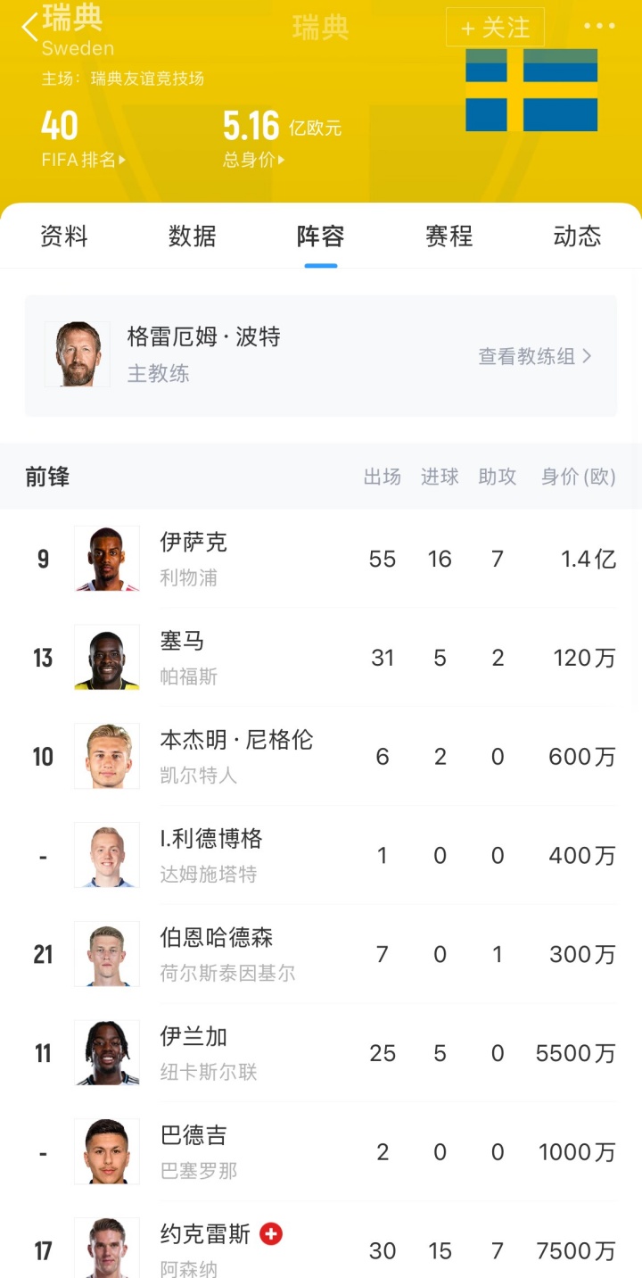 瑞典队威望总身价高达5.16亿欧,领有伊萨克、约克雷斯、伊兰加等球星,但世初赛一胜难求,1平4负仅积1分,只进了3球却丢了11球。托马森上月因灾祸战绩下课,波特接办后首秀却1-4惨败。