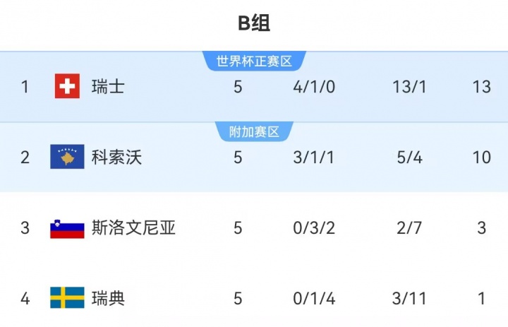 11月16日讯 世初赛欧洲区,瑞典1-4不敌瑞士,五轮仅积1分排行垫底。
