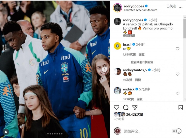 此役罗德里戈为巴西队首发出战,定位球助攻卡塞米罗破门,赛后罗德里戈社媒晒照庆祝告成,配文:“为国出战,感谢伦敦!专注于下一场比赛!”