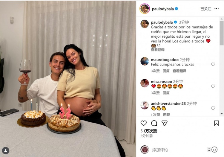 迪巴拉社媒晒出与怀胎浑家整个庆祝的合照,配文:“感谢公共的寿辰祝愿,最棒的礼物行将到来,我已迫不足待!爱你们统统东谈主。”