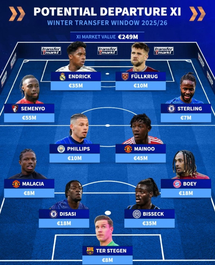 中场:塞梅尼奥(伯恩茅斯,5500万)、卡尔文·菲利普斯(曼城,1000万)、梅努(曼联,4500万)、斯特林(切尔西,700万)