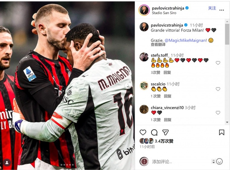 帕夫洛维奇社媒晒出亲吻迈尼昂的像片,配文:“伟大的顺利,加油米兰!谢谢你,迈尼昂。”