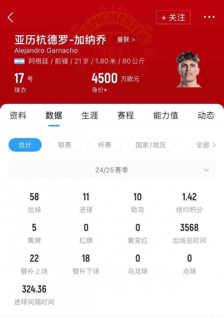 加纳乔现年21岁,上赛季各赛事出场58次,孝顺11球10助。当今球员德回身价为4500万欧元。