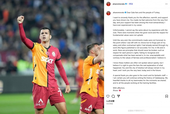 💣莫拉塔炮轰加拉塔萨雷:不守情愿,我被动烧毁赚得的部分薪资