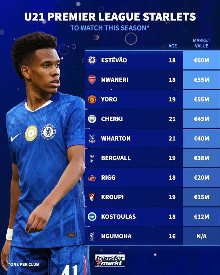 德转盘货英超U21身价:埃斯特旺6000万欧元居首