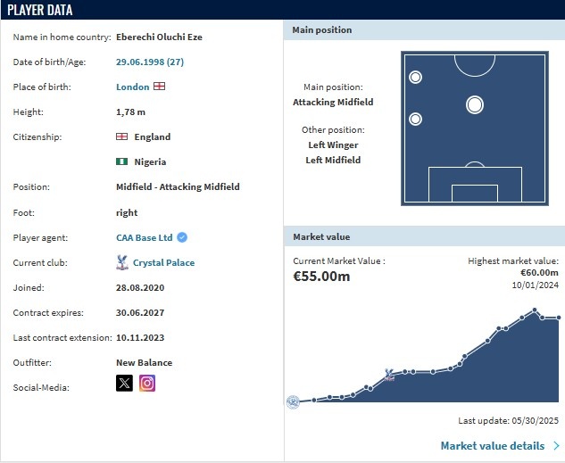 天然,埃泽莫得亏负主帅、高管们的信任,在水晶宫服从的169场比赛,他打出40个进球28个助攻的得益,抑制不俗,也渐渐成长为了统统这个词英格兰顶级的引导官。到这个夏令转会窗,他离队音信满天飞,经纪团队也在神勇给他找到登陆权门的机会。不外埃泽本东谈主却莫得被这么音信打乱节拍。