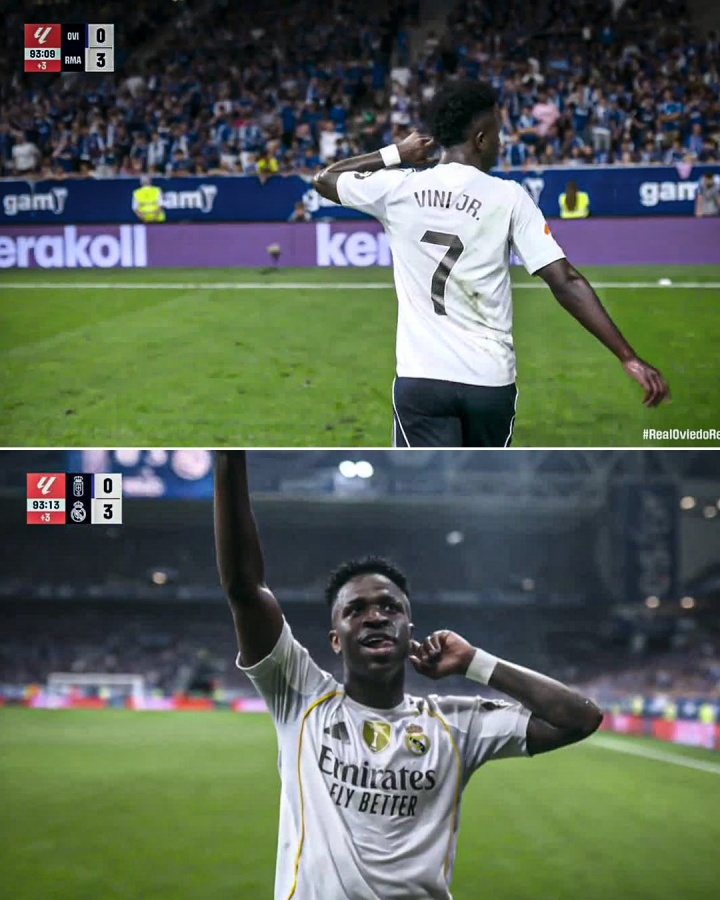 遭皇家奥维耶多球迷狂嘘!维尼修斯进球后指耳朵+指看台叛逆☝️