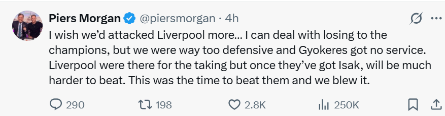虎扑09月01日讯在此前放置的一场英超比赛中,阿森纳0-1不敌利物浦。本场比赛放置之后,知名主握东说念主、驰名枪迷皮尔斯-摩根更新了酬酢媒体,发文谈到了他对这场比赛的认识。