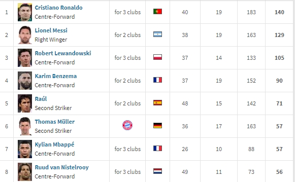 欧冠历史弓手榜:(数据开端德转)
