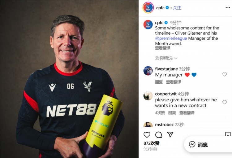 10月14日讯 水晶宫官方晒照,主解释格拉斯纳领取9月份英超最好解释奖项。