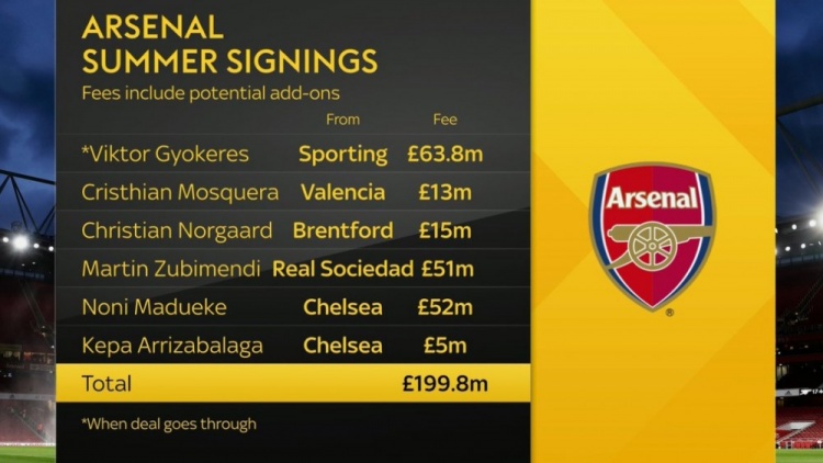 7月25日讯 近日,太空体育清点了阿森纳实现现在的引援情况,他们引进六名球员一共破耗了近2亿镑。