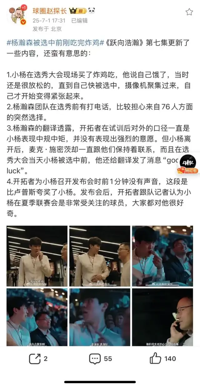 杨翰森等于典型的例子。这位20岁的淄博小伙,在2025年NBA选秀中被斥地者以首轮16顺位选中,成为自2016年以来首位被NBA选中的中国球员。数据自满,微博上杨瀚森选秀后粉丝增长杰出100万,超话聚合97万名慕杨东说念主。